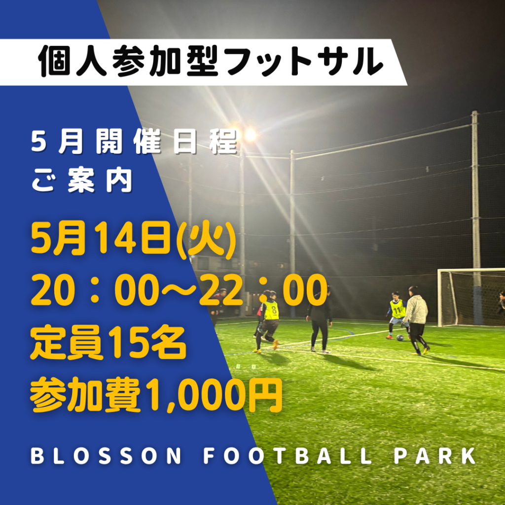 5月の個人参加型フットサルの開催日程のご案内をさせていただきます😊